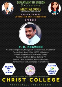 The second session of Medialogue, Add-on Course on ‘Journalism and TV Anchoring’, organized by the Department of English, Christ College, Vizhinjam, was held on 27th May 2021 at 11:30AM via Google Meet Platform. The chief guest of the day was MR. P.R. Praveen who is currently serving as Coordinating Editor of Malayalam Express News.
