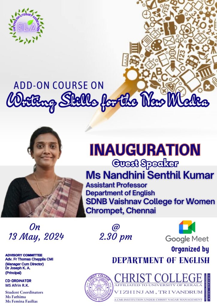 The Department of English in association with the English Literary Association (ELA) has organized an add-on course for the S4 BA English Language and Literature and BA English and Communicative English students on “Writing Skills for the New Media”. The course was inaugurated by Ms Nandhini Senthil Kumar (Assistant Professor, Department of English, SDNB Vaishnav College for Women, Chennai) on 13th May, 2024. The course intended to devise students’ writing approaches in various new media platforms. Students delved into interactive sessions on new media writing and were able to master the fundamental best writing practices that will enable them to engage with creative content creation in today’s multimedia world. The course envisaged to provide an opportunity for the students to amplify their skills in new media content creation. New media writing, a demanding realm in today’s digital arena holds an overarching role among emerging content writers. This course equipped  students with the confidence to stand out in the new media world.