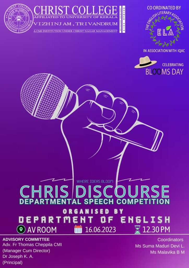 The Department of English and ELA’ 23 in association with IQAC, conducted a speech competition on Bloomsbury Writers in connection with Blooms Day on 16th June 2023, at AV Room. Participants from various departments participated.