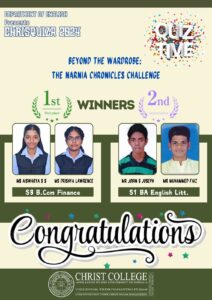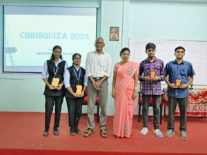The CHRISQUIZA Interdepartmental Quiz Competition, organised by the Department of English under its English Literary Association, was a resounding success, with enthusiastic participation and keen competition that ran through eight rounds. The quiz master Dr Roshan R from the Department of Management Studies led the quiz. The event showcased the intellectual prowess of students across different disciplines, with the Team E, Ms. Aiswarya S S and Ms. Drishya Lawrence, from S3 B.Com Finance emerging as the champions. The first runner-up was Team B, Mr Muhammed Faiz and Jobin S Joseph, from S1 BA English Language and Literature. Dr. Joseph K. A., Principal of Christ College, Vizhinjam, awarded prizes to the winners as the ceremony came to an end.