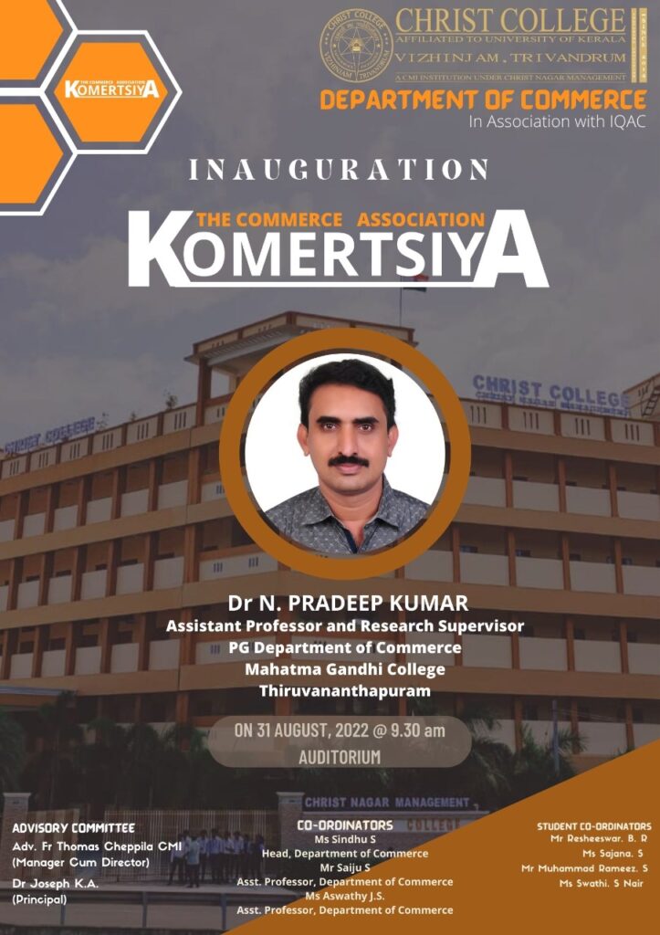 The inauguration of the Commerce association- ‘KOMERTSIYA’ of Christ College Vizhinjam held on 31st August, 2022 at College Auditorium conducted by Department of Commerce.The Commerce association coordinators Ms. Sindhu. S, Mr. Saiju S, Ms. Aswathy J S, along with the student co-ordinators Mr. Resheeswar.B.R, Ms. Sajana S, Mr. Muhammed Rameez. S and Ms. Swathi. S. Nair organized the memorable event. A person of integrity and intelligence Mr. Pradeep Kumar, Asst. Professor and Research supervisor PG Department of Commerce Mahatma Gandhi College Thiruvananthapuram was the chief guest at the function, who willingly accepted our invitation to be with us and encourage us by his inspiring presence.the main aim of the association are to the overall personality development of the students. Programs like elocution competitions, guest lectures, social awareness activities, etc are organized. Students develop leadership qualities and job orientation skills, which improve their performance in the globalized world.