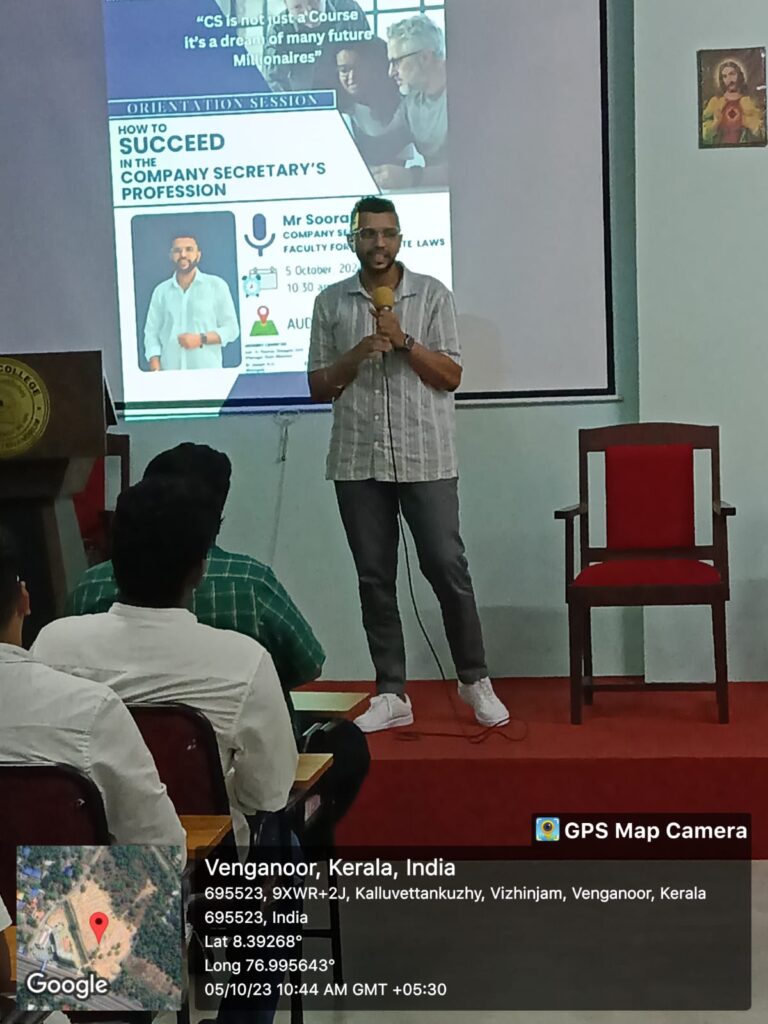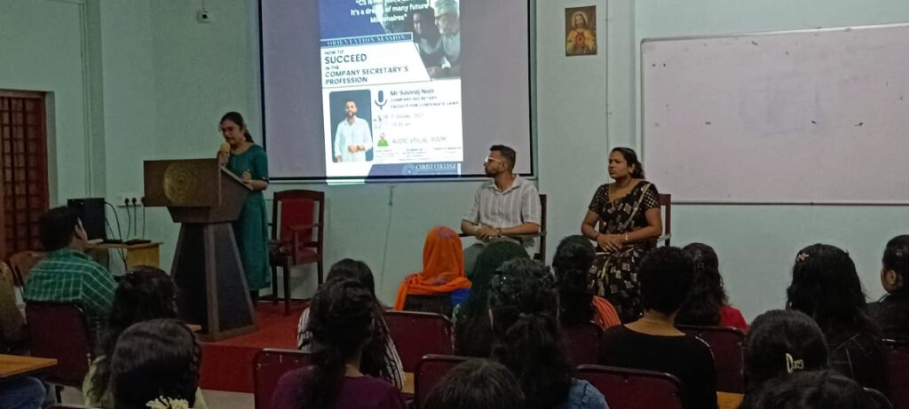 The session was wonderfully conducted by Mr. Sooraj S Nair, Company Secretary. The objective of such an orientation programme is to sensitize the students regarding the course curriculum, study schemes, examination pattern and training structure. Through the orientation programme, students will also be made to understand the scope and opportunities of the CS profession and they will be sensitive for their career as a CS. He explained in detail about the role of a Company Secretary as he is responsible for the efficient administration of a company, particularly with regard to ensuring compliance with statutory and regulatory requirements and for ensuring that decisions of the board of directors are implemented. He shared his experience as a CS in corporate companies among the students and which encouraged them to choose the profession