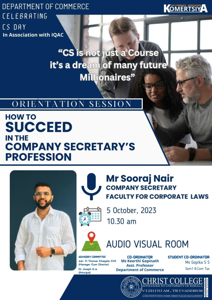 The session was wonderfully conducted by Mr. Sooraj S Nair, Company Secretary. The objective of such an orientation programme is to sensitize the students regarding the course curriculum, study schemes, examination pattern and training structure. Through the orientation programme, students will also be made to understand the scope and opportunities of the CS profession and they will be sensitive for their career as a CS. He explained in detail about the role of a Company Secretary as he is responsible for the efficient administration of a company, particularly with regard to ensuring compliance with statutory and regulatory requirements and for ensuring that decisions of the board of directors are implemented. He shared his experience as a CS in corporate companies among the students and which encouraged them to choose the profession
