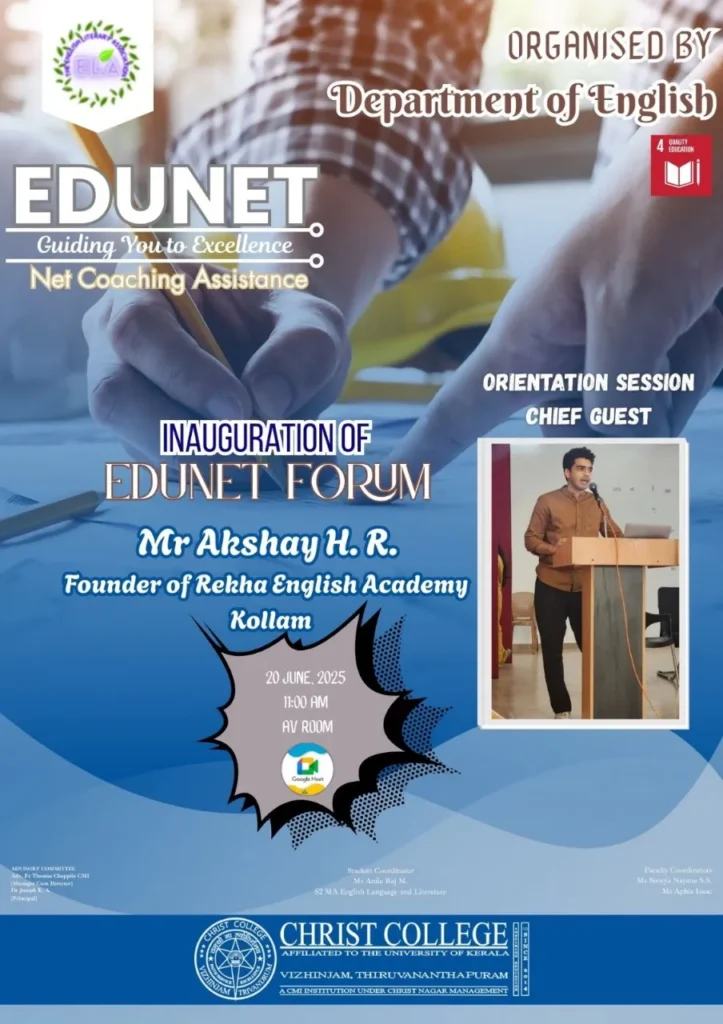 EduNet Forum, an initiative of Department of English was inaugurated on 20th June 2025 at 11:00 AM by our esteemed guest Mr. Akshay H.R., Founder of Rekha English Academy, Kollam. This forum is dedicated to providing guidance and support for NET aspirants.