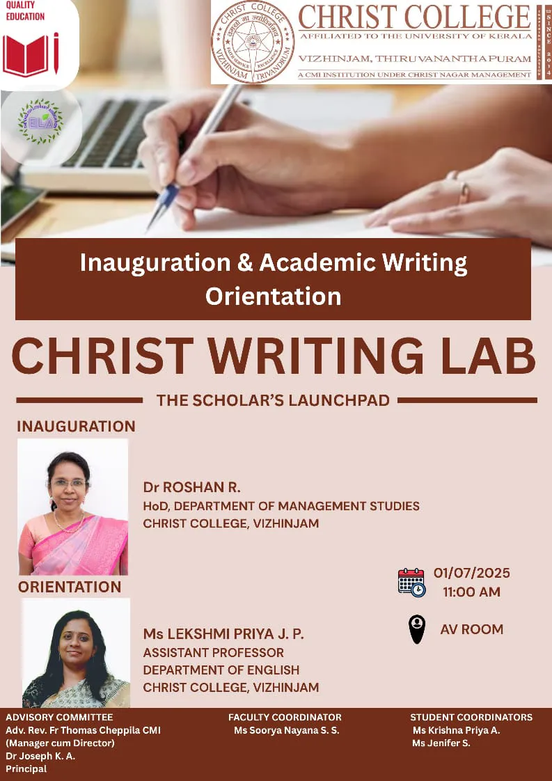 Christ Writing Lab Inauguration and Academic Writing Orientation was held on 01 July 2025 at Christ College, Vizhinjam, organized by the Department of English. The