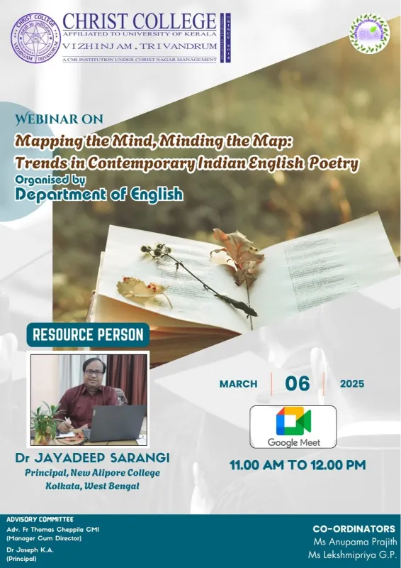Department of English of Christ College, Vizhinjam hosted an insightful webinar titled “Mapping the Mind, Minding the Map: Trends in Contemporary Indian English Poetry.” This