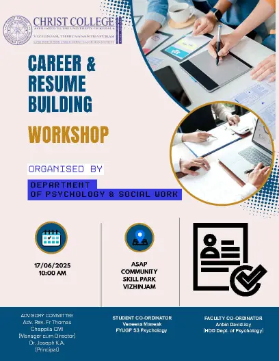 Report on Career and Resume-Building Workshop On 17th June 2025, the Departments of Psychology and Social Work at Christ College, Vizhinjam, jointly organized a Career