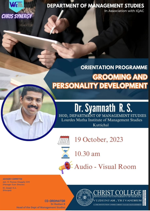 The orientation session on Grooming and Personality Development was taken by Dr Syamnath R S. The session was initiated by Dr Joseph K A, the