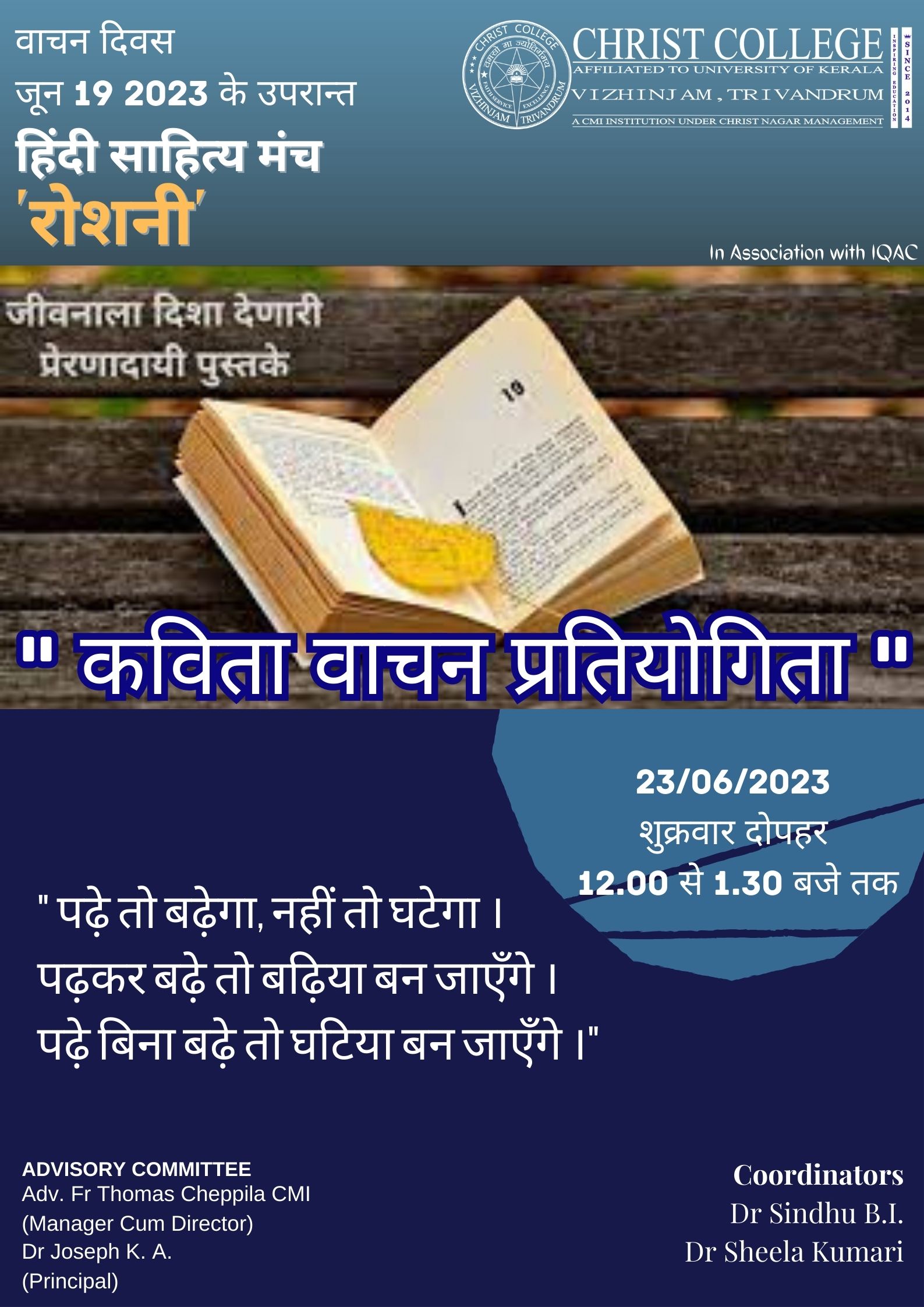 The Malayalam Literature Club of Christ College Vizhinjam conducted a short story reading competition on 22nd June 2023 from 10 am to 11.30 am in