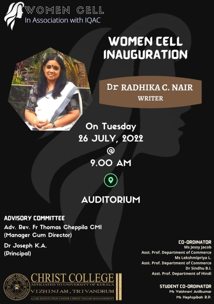 Christ College, Vizhinjam started Women Cell with the objective to create awareness among the issues relating to gender equality and sexual harassment, to help them attain their own stand in a competing world and overall development in all spheres of their life. It is named as “AGNI” “FLY BEYOND THE BOUNDARIES” the cell was inaugurated by launching a video by our chief guest Dr.Radhika C Nair (Writer).