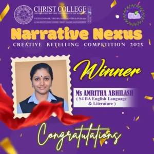 As part of Reading Day celebrations, the Department of English organized ‘Narrative Nexus,’ a Creative Retelling Competition on June 19, 2025. Participants showcased their creativity by crafting alternative endings to the iconic story ‘Chemmeen’. The winner of the competition is Ms. Amritha Abhilash, a student from the S4 BA English Language & Literature.