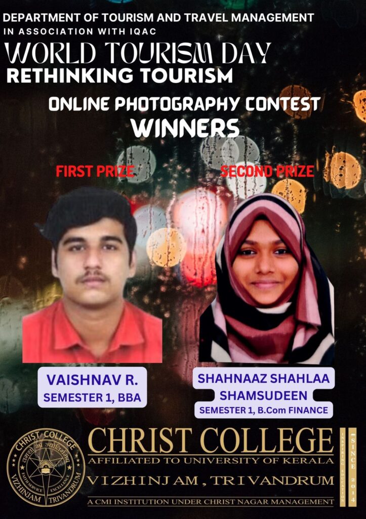 The Department of Tourism and Travel Management has conducted an online photography contest to celebrate World Tourism Day on 27-September 2022 on the Theme -‘Rethinking Tourism’. Mr. Sarath Kumar S R, Mr. Joseph P Job and Ms. Anu Abraham were the teacher Coordinators. Student coordinator was Mr. Sacratice Samuel. The programme was conducted for whole college. In which Vaishnava R of S1 BBA won first prize and Shahanaaz Shahlaa Shamsudeen of S1 B.com finance Placed second position. The Prizes were distributed by Principal Dr. Joseph K A.