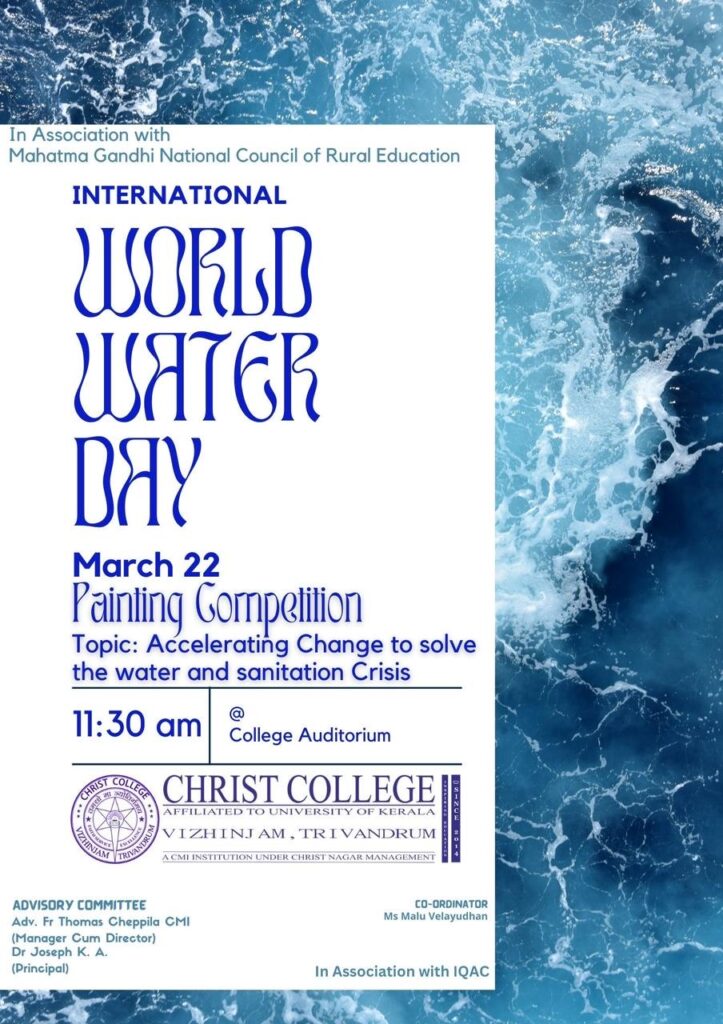 The competition was held on March 22nd 2023, Wednesday from 11:30am to 12:30pm at the college auditorium. The topic of the painting competition was “Accelerating Change to Solve the Water and Sanitation Crisis”. The advisory committee which comprises of Dr. Joseph K.A, Principal and Rev. Fr. Adv Thomas Cheppila CMI, provided valuable guidance and constant support from the very beginning of this initiative. The session was coordinated by Ms Malu Velayudhan, Assistant Professor, Department of Commerce. The members of MGNCRE Mr Joseph.P Job, Ms Neethu John, Mr Sandanu J.B, Ms Meera Raj B.M, Ms Devika Anil, Assistant Professors, Christ College, Vizhinjam also provided their continuous support and guidance.