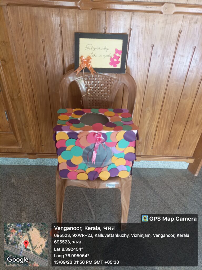 Such type of positive and enriching quotes were placed in a box that was prepared by the Students of Department of Psychology. The colorful box consisting of motivational positive quotes was placed next to the Principal’s office adjacent to the Reception desk. The box was inaugurated by our honorable Principal Dr Joseph K.A at 10.00 am in front of the office with the presence of Department HOD’s and other Faculty members.