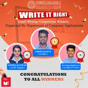 As part of the Email Day celebration, the Department of Computer Applications conducted a session titled “Write It Right”. The event focused on guiding students to write effective and professional emails. It featured an email writing competition, where participants had to draft an email on the topic: “Application for MBA Admission in a Foreign University”. The session saw active participation from students across different departments. The entries were evaluated based on language clarity, format, tone, and relevance. The best entries were awarded prizes.